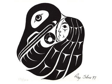 The raven is the trickster who takes the time to teach us what we need to know. A woman, (note the labret in her lower lip) is prominent because women are the holders of knowledge and keepers of the culture. The raven is protecting the woman by covering her with its wing so the culture remains safe. The design elements and shape reflect Stό:lō Art forms. The circular shape represents a spindle whorl. The raven’s talons in the middle of the design form the centre hole of the whorl. The spindle whorl references Coast Salish weaving, an important skill for Stό:lō men and women, which continues to be steeped in story and cultural traditions.